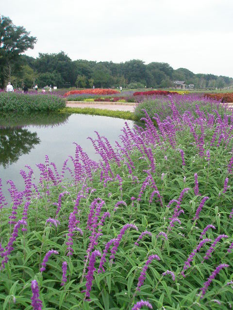左に見えるエントランス広場(水盤池)にはアメジストセージが