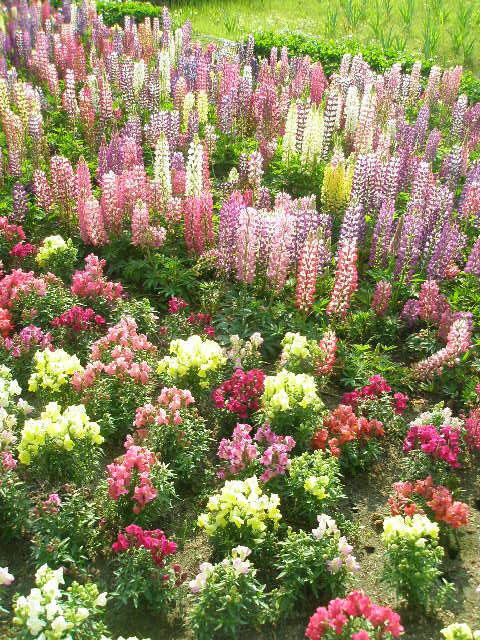 1万2千株のキンギョソウとルピナスのカラフルな散歩道。