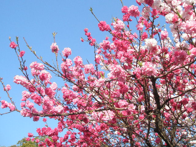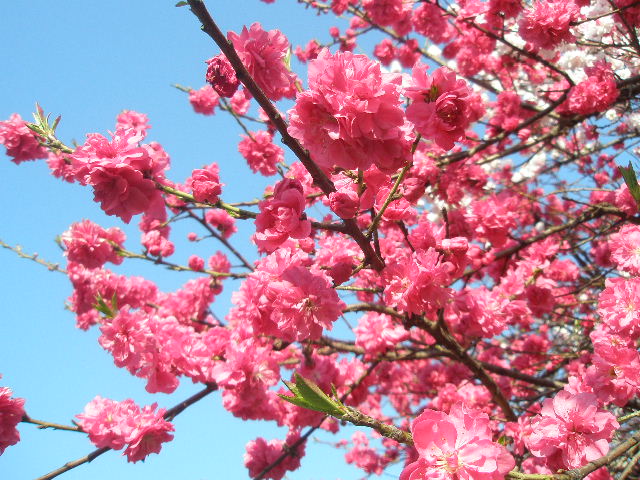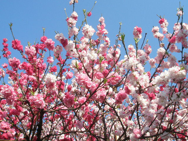 「実モモ」の花はその名の通り桃色(ピンク色)で桜や梅に似ていますが、「ハナモモ」の花はより大きくて八重桜に似たものが多く、色は、桃色の他に白・赤などがあります。