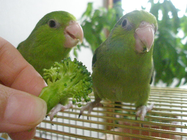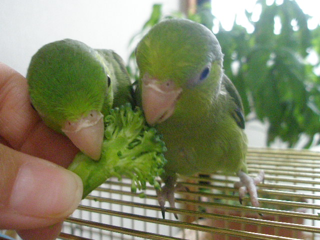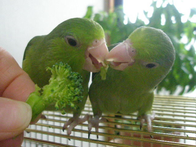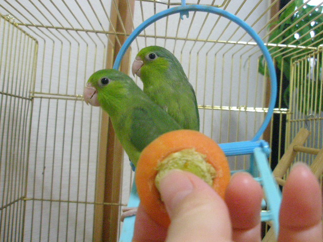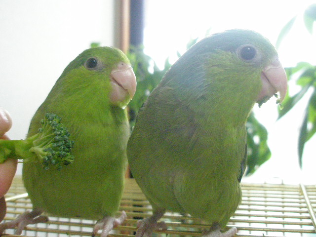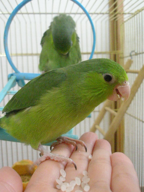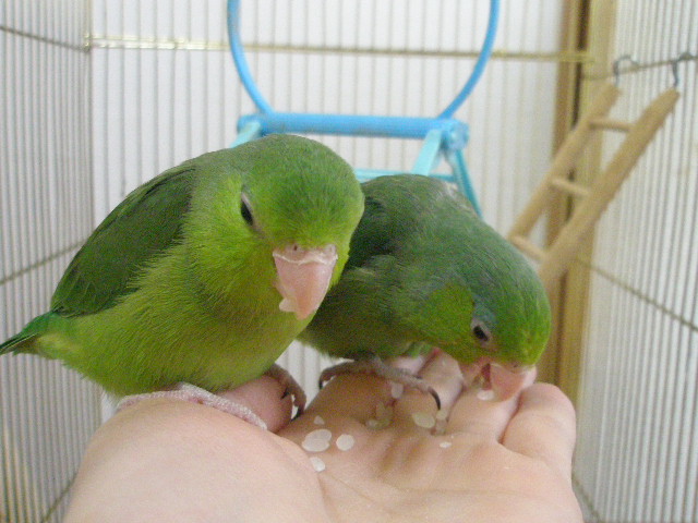 2羽が乗った手をゆっくりゆっくりケージから出して、今日はケージ上で食べています♪