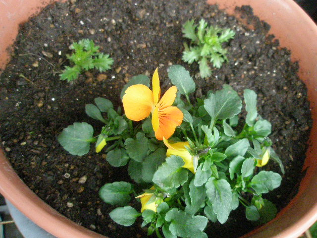 真ん中・・・桃色タンポポ(クレピス)2株・オレンジ色のビオラ1株・ノースポール1株。