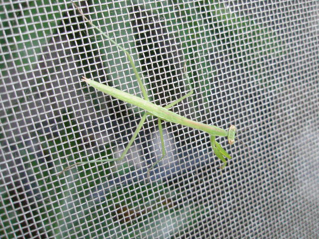 朝ベランダに出ると、網戸にカマキリの子どもがいました。