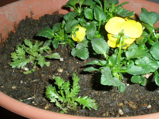 昨日”こぼれ種で発芽したノースポール”を頂いたので、ビオラの鉢へ。