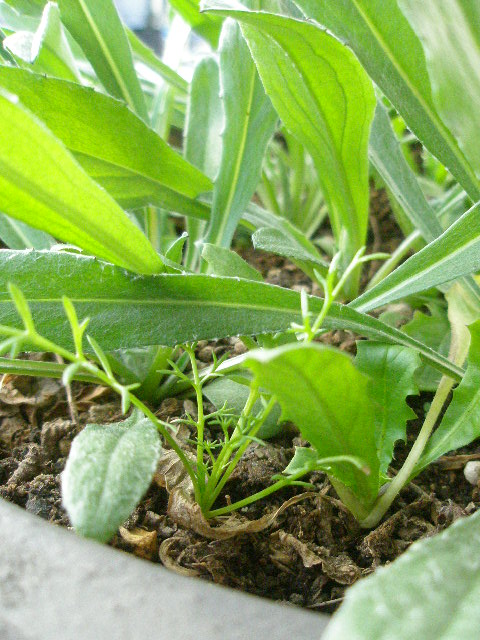 使いまわしの土なので、あっちこっちから芽がでてきます。