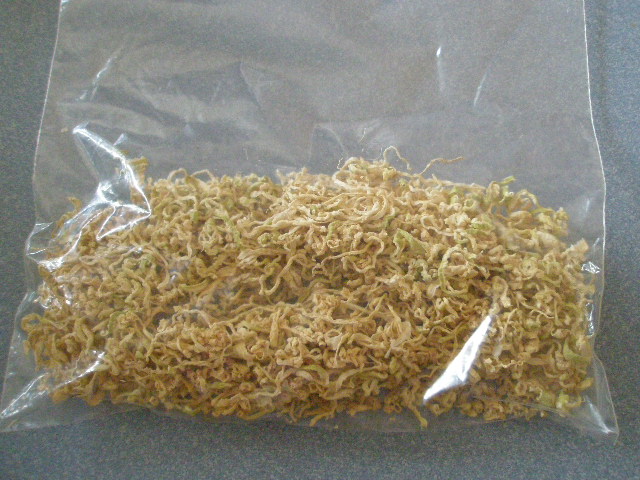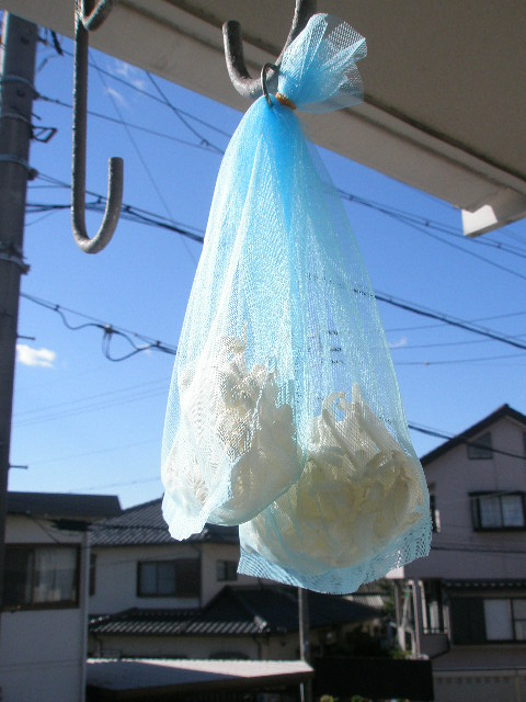 一握り程ネットに入れて吊るし、たまに上下に振って全体に風が当たるようにしています。