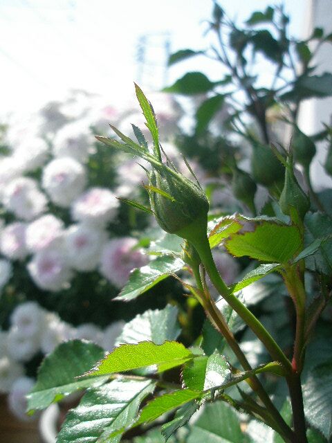 ミニバラも一枝に3~5個程蕾が付いて、日に日にぷっくりしてきます。
