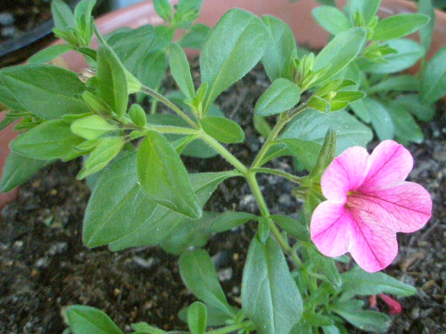 ピンクのカリブラコアは株を大きくする為、早々に摘心しました。