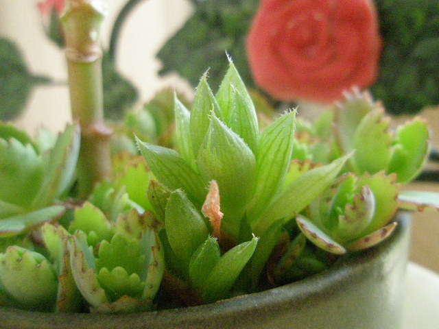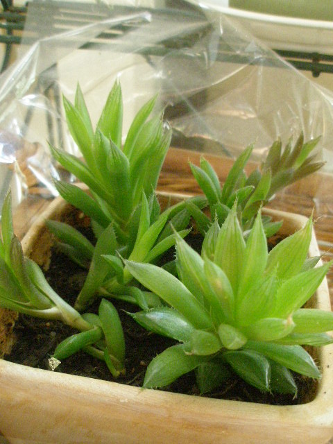 子宝草の根元でひっそり成長し、夏の間ずっと外で管理してた子も先日、室内へ取り込みました。