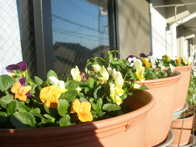 ベランダでは、ビオラの花が全部開花しましたよ~☆