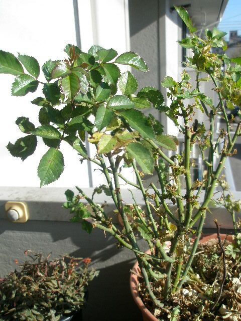 葉がほとんど落ちちゃって寂しい姿になっているミニバラ。