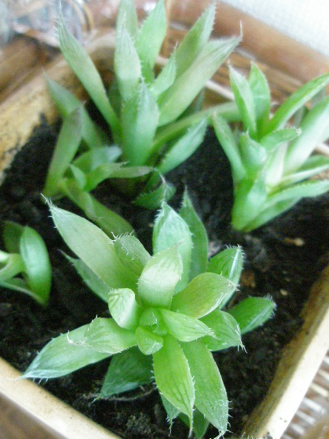 そうそう、梅雨で大雨&風が強かった日、パインアップルの葉が子宝草をバンバン叩いて、子株をほとんど落としたことがあったなぁ~(懐)