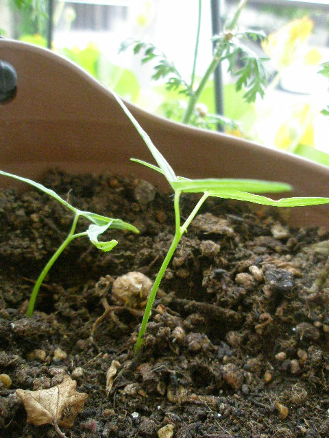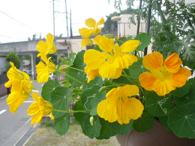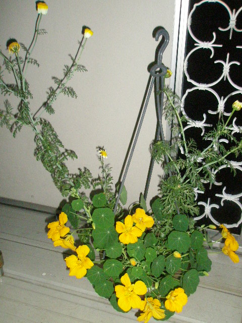 予想以上に春菊の丈が高くなってバランスが悪ぅ~な春菊とナスタチュームの寄せ植え。元気元気♪
