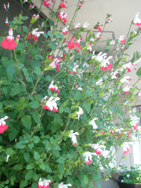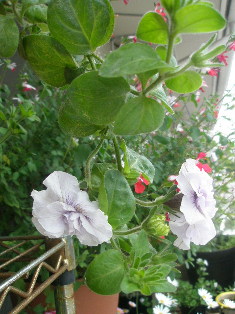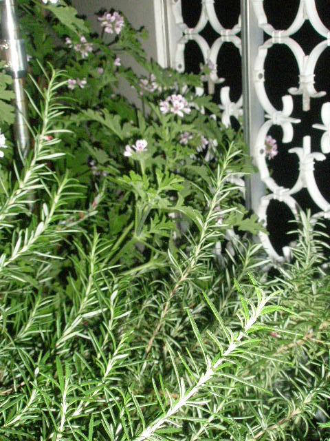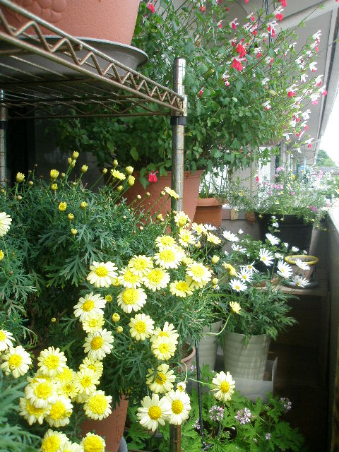 ベランダいっぱいに広がって開花中のローズゼラニューム。
