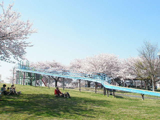 先日も行った桜のキレイな公園には大きなすべり台があります。