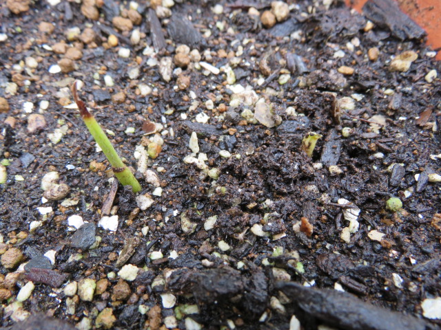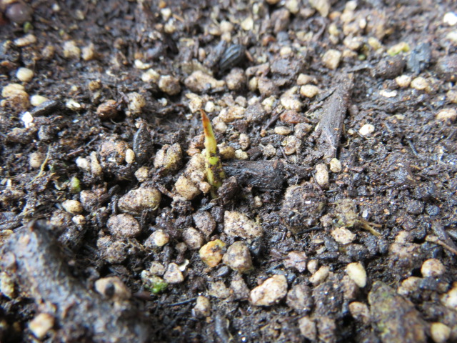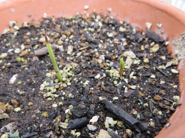 マニラ椰子と一緒に謎の椰子の種を埋めたのですが、今になって発芽してきました。