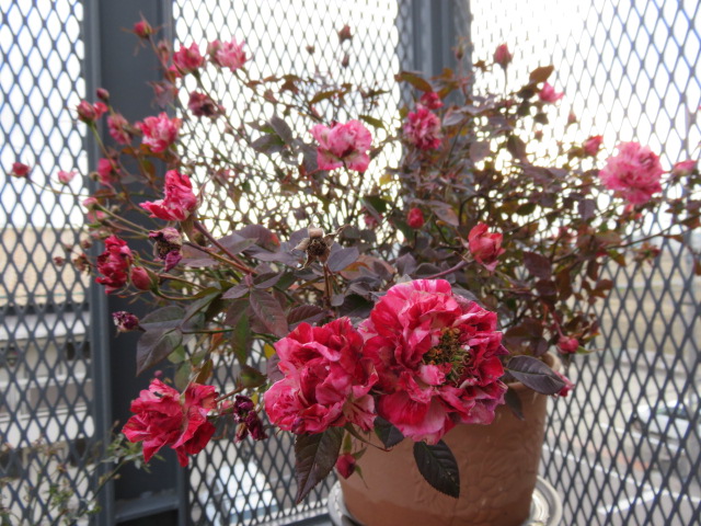冷たい風に耐えながら、今も咲き続けているマーブルミニバラ。