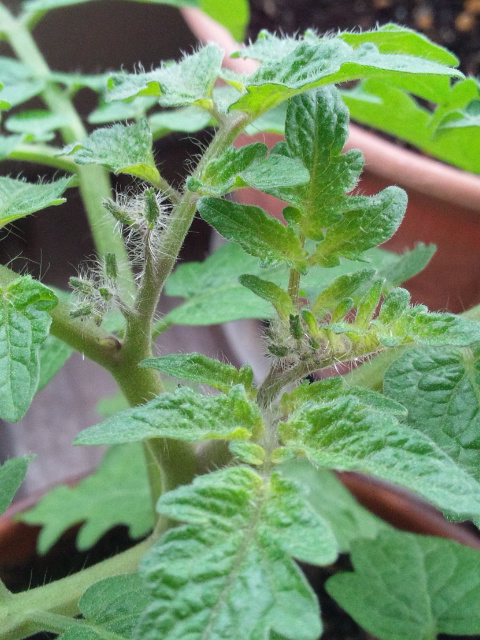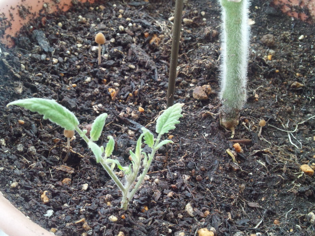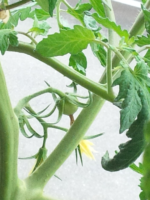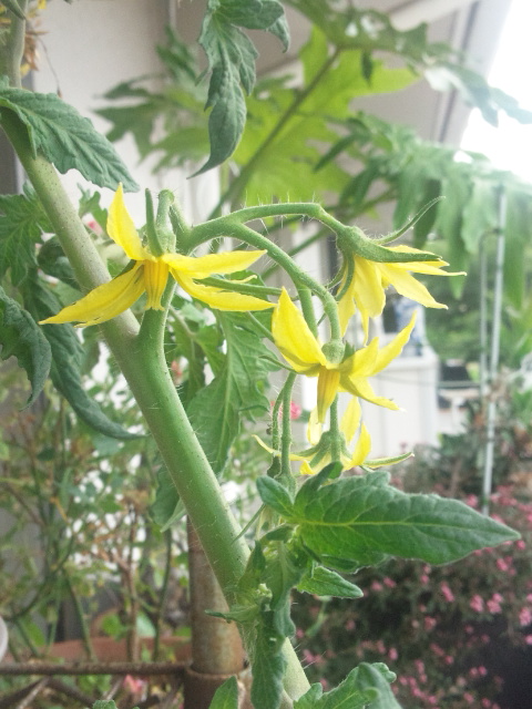 種まきトマトは凄く立派な株で、1段目には小さな実、2段目にはミニトマトの2周り程大きな花が咲いていました。