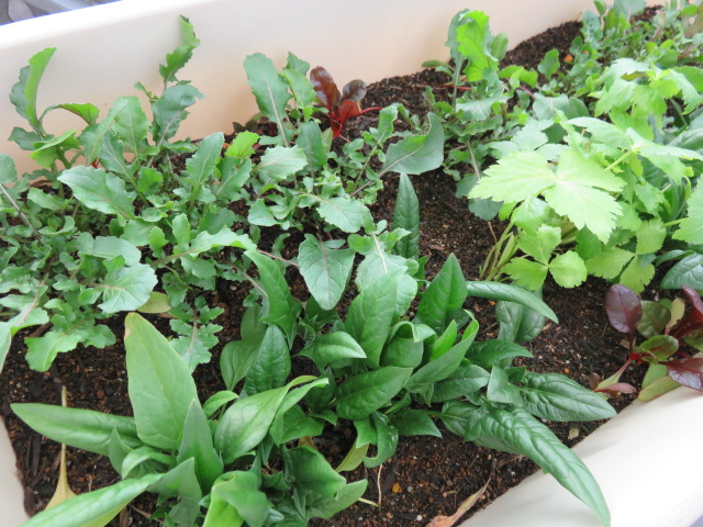 ルッコラ、ほうれん草、スイスチャード。最近ミツバも追加しました。