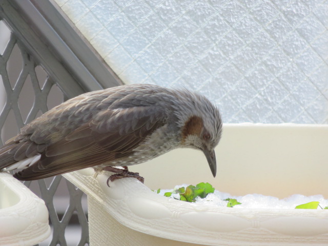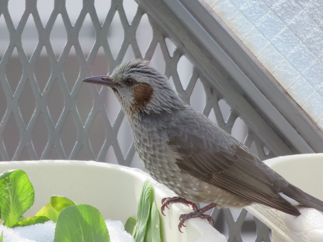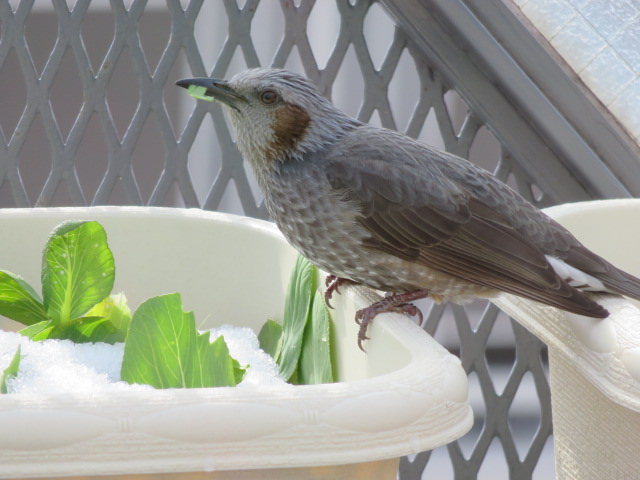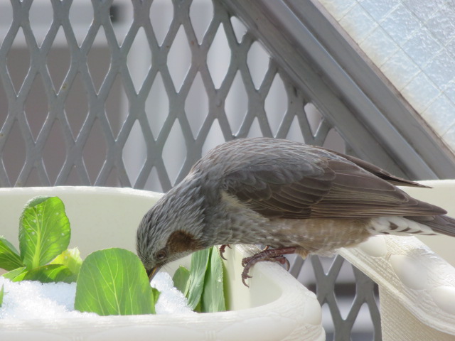 最近、葉野菜が千切られているなと思っていましたが犯人は、いや、犯鳥はヒヨドリでした。