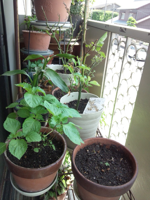 ミニバラ3種、紫蘇、観葉植物、矮性トマトを適当に置いているだけの棚。