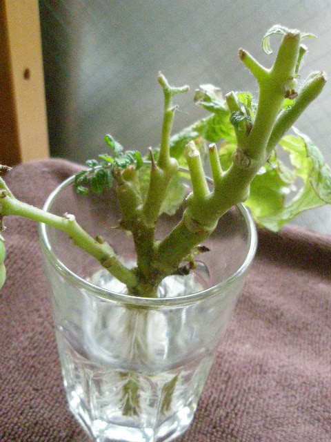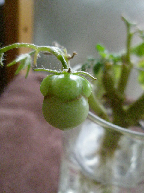 捨てたと書きましたが、実は上部をカットし室内で水挿ししていた矮性ミニトマト。