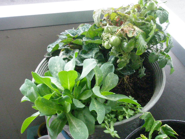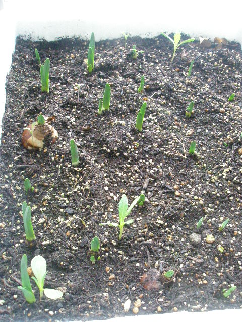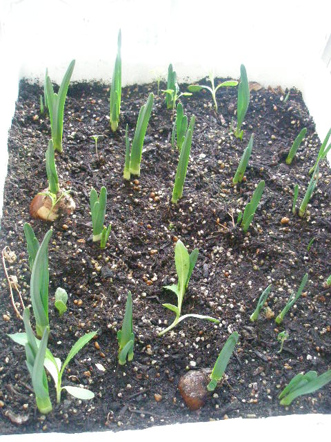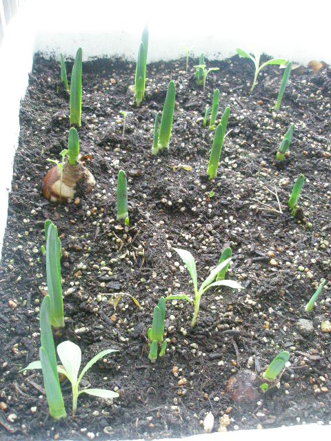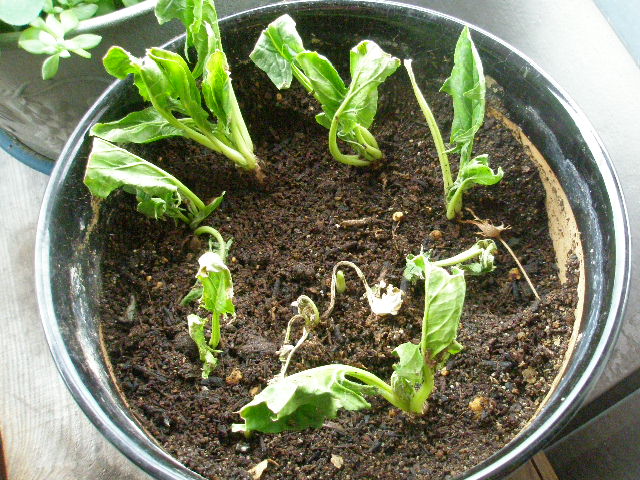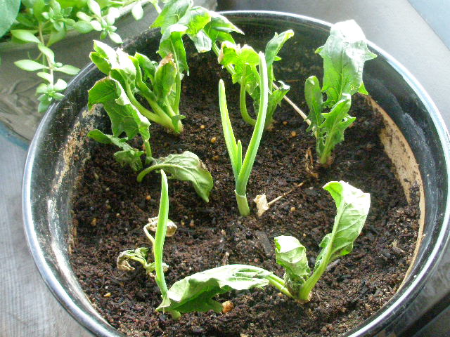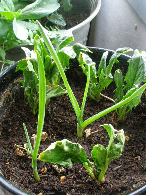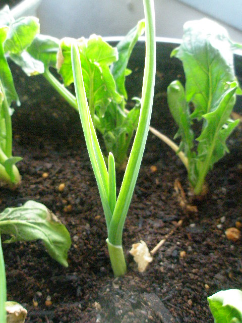 2株枯れたほうれん草と更に芽が伸びたニンニク。