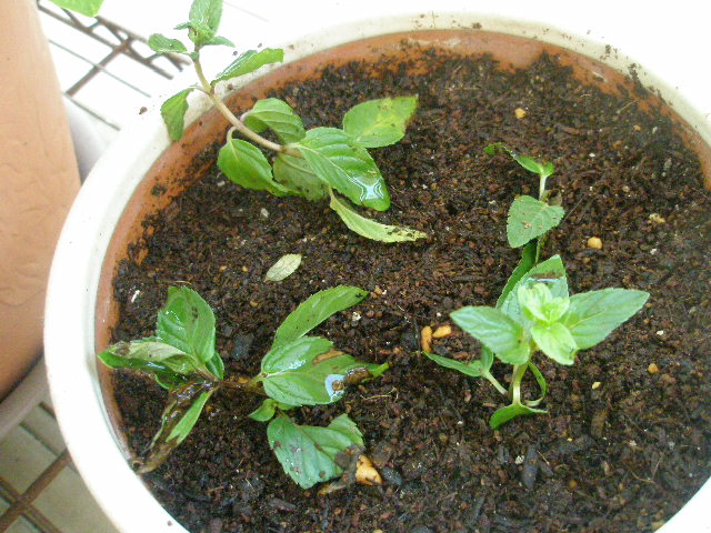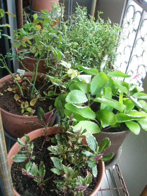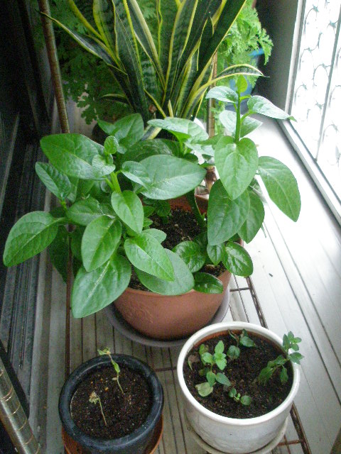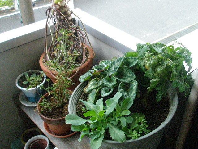 中央の金時草は害虫の住処になりちょっと可哀想な姿になっていますが、手前の鉢はいい感じ。