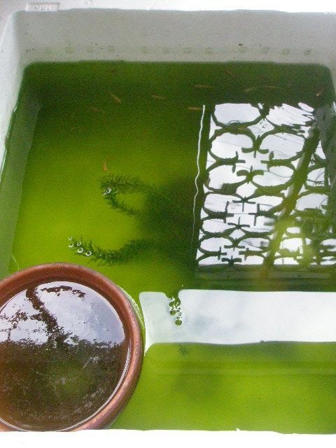 2代目の白メダカの稚魚たちは、グリーンウォーターを汲んできて室内で管理していました。