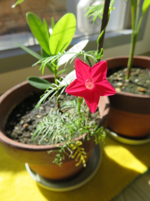 室内で開花したルコウソウ。白色だと思っていましたが赤色でした。