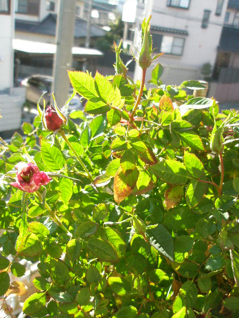 こんなに寒いのに、蕾があがっているミニバラたち。
