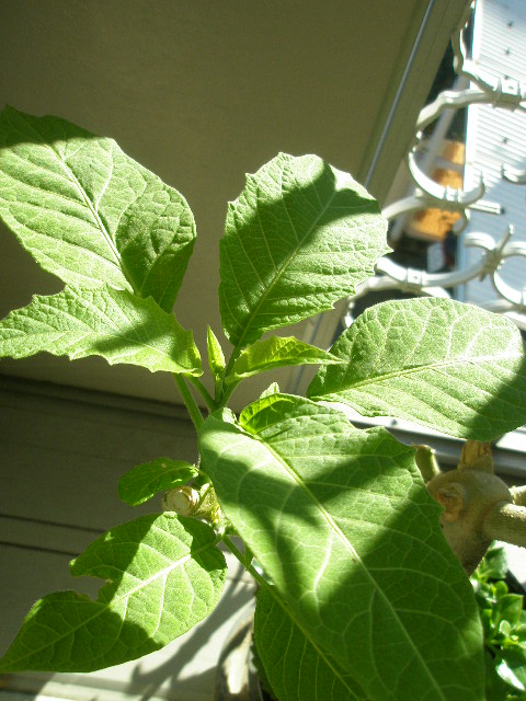 花壇に植えたものは大きく成長していますが、植木鉢だと可哀想・・・なエンジェルストランペット。