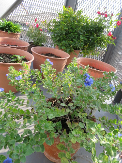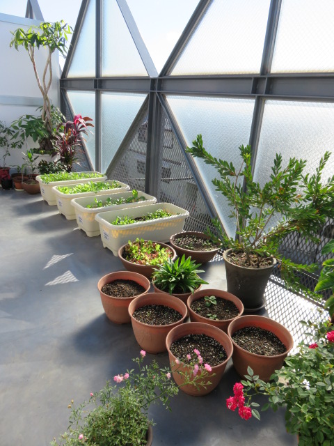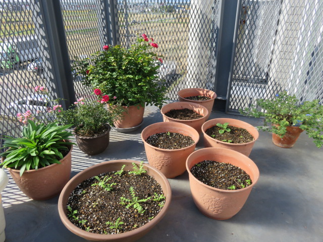 種まきした鉢などの花は、1ヶ所にまとめて管理。