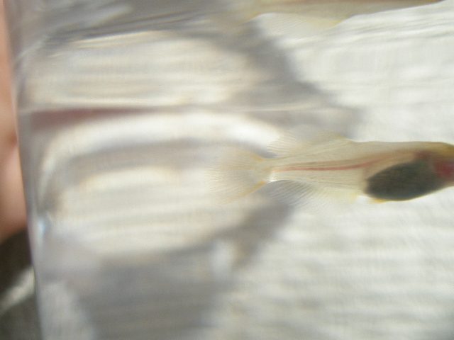 普通種は尾ひれが三角形に対し、ヒカリメダカはひし形のような波型のような感じ。