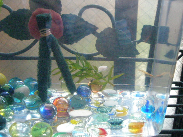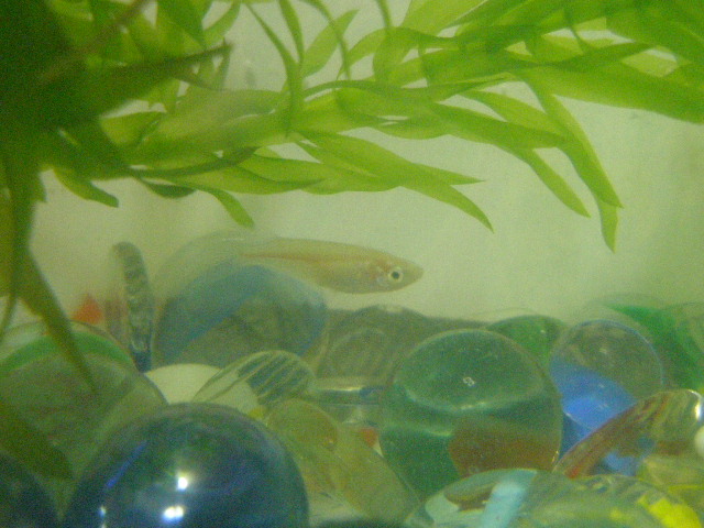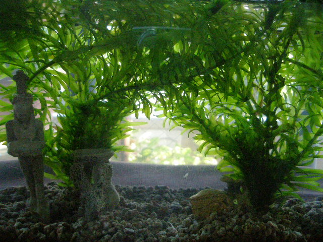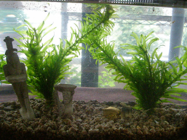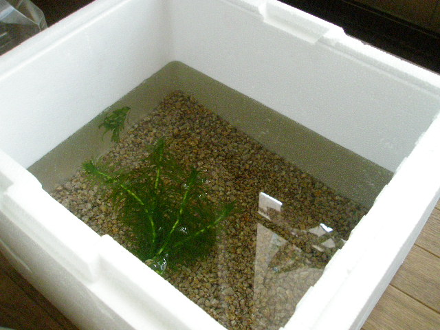 野良メダカ。麦飯石を敷いて、アナカリスとなんちゃって卵トリーナーを入れましたが・・・