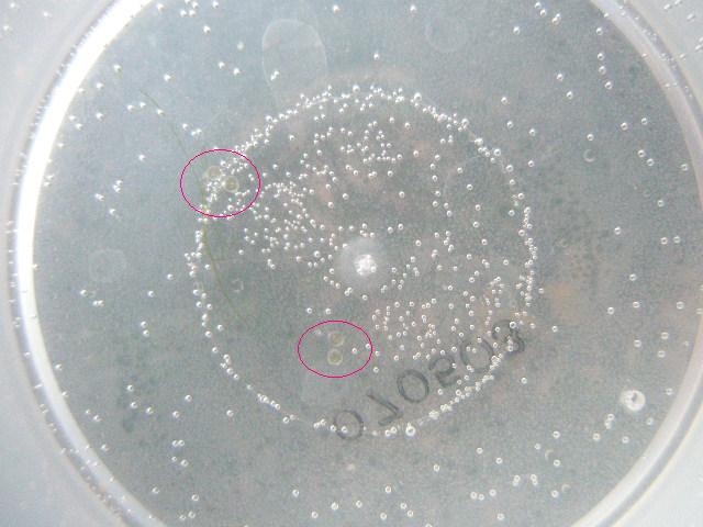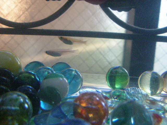 頂いた白メダカのほとんどの稚魚たちは水面付近で寝ていますが、採取した子たちはビー玉に体を埋めて寝ています。(今床砂がないので、臨時でビー玉を入れています)