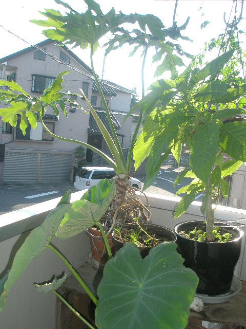 室外機の熱風にも負けない!負ける気がしない!セローム、エンジェルストランペット、フウセンカズラ。