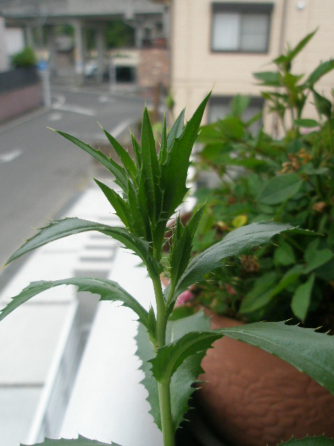 1本は真っ直ぐ、もう1本はクネクネと生長している紅花。