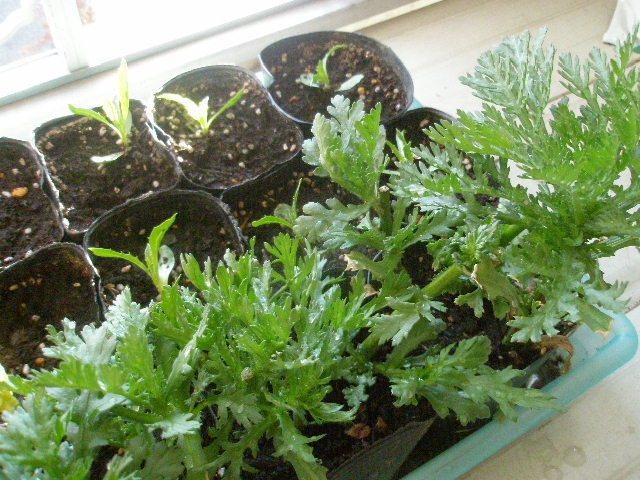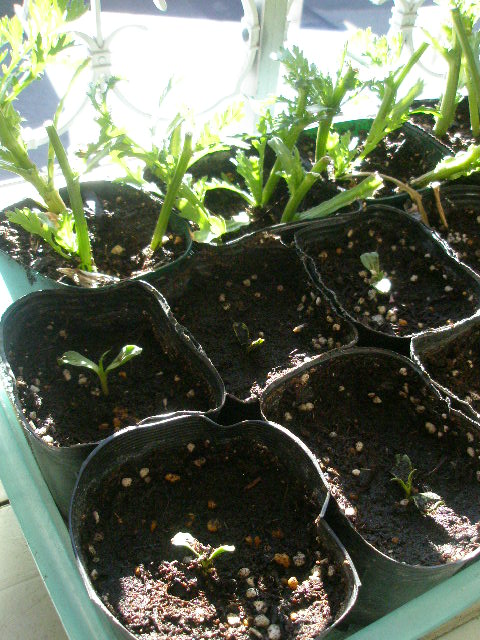 奥は水挿しし、発根した春菊を植えつけたもの。