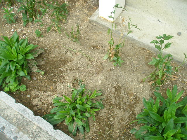 ワスレナグサだと思って育てている植物にもいっぱい土が掛かっていますね(怒)